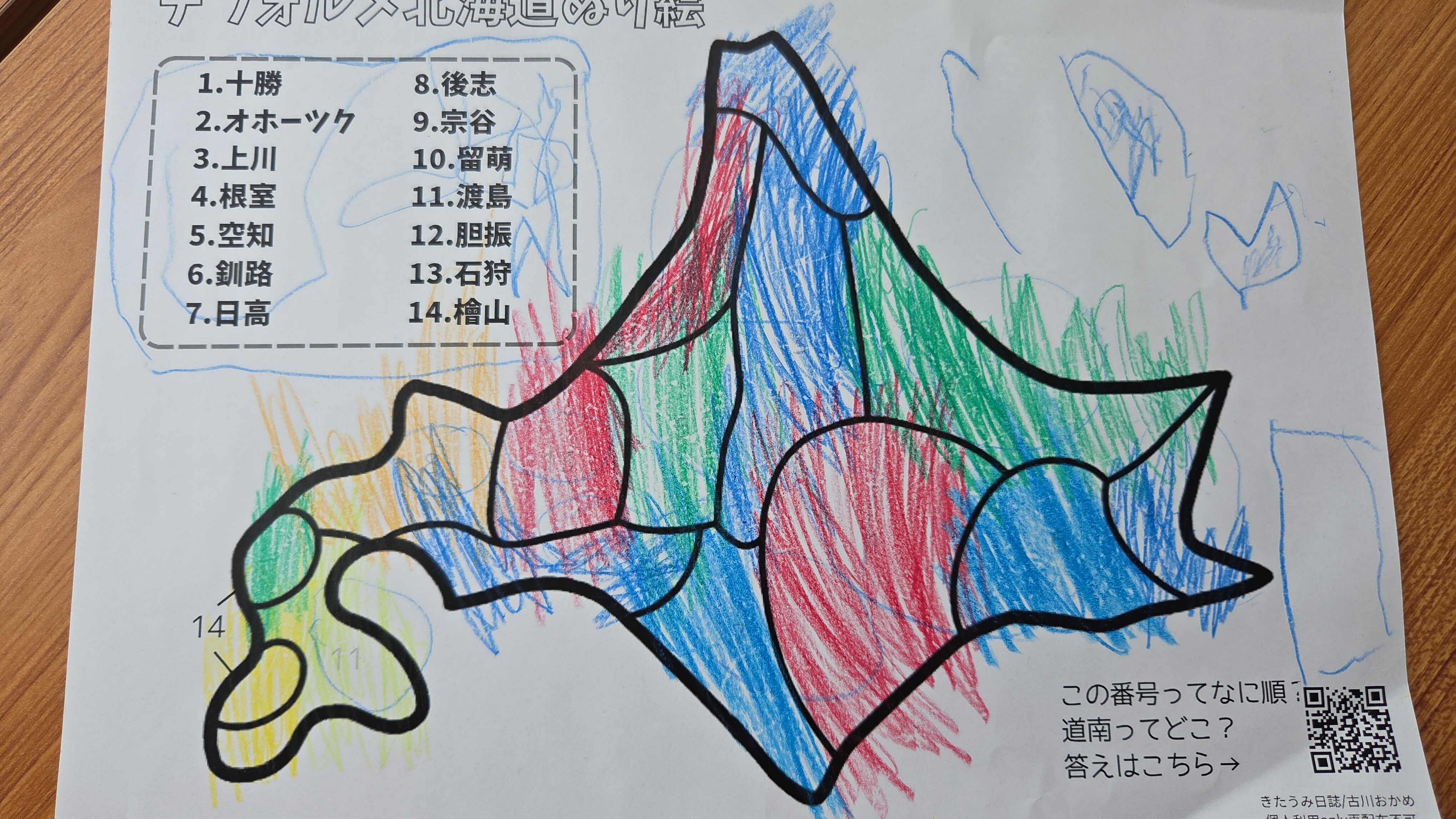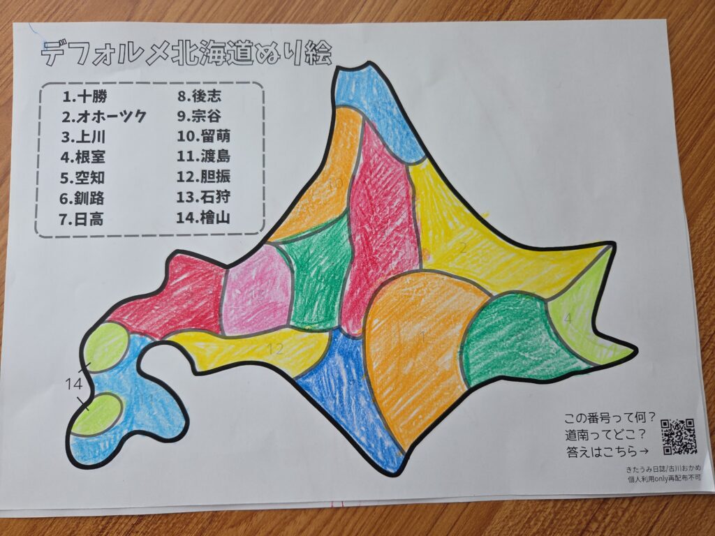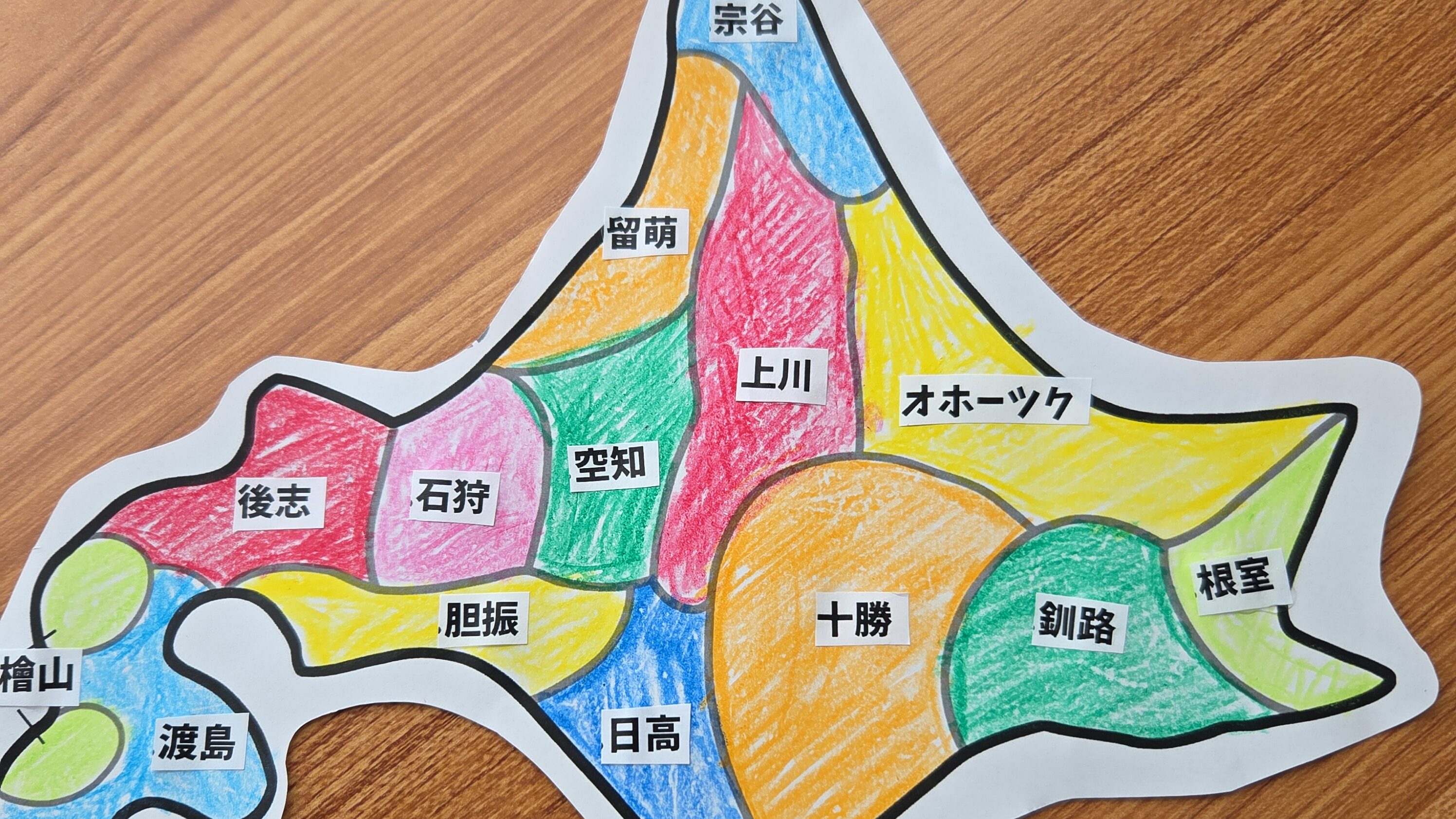 塗り分けて、振興局の名前を貼って北海道のエリアを覚えるきっかけになります。
