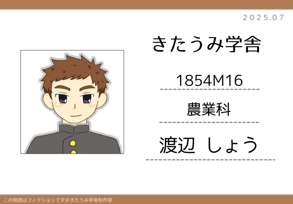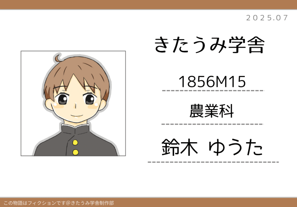 2025.10.19 登場人物たち 農業科生徒 okame-furukawa ※歴史創作フィクションサイトです。 実在の人物・団体・具体的な出来事とは関係ありません。 黒曜寮 依田つとむ モデル 詳しくは コチラ(きたうみ日誌・晩成社まとめ) 鈴木ゆうた モデル 詳しくは コチラ(きたうみ日誌・晩成社まとめ) 渡辺しょう モデル 詳しくは コチラ(きたうみ日誌・晩成社まとめ) 古川 おかめ歴史好きの北海道民。 史実を元にしたフィクションを考えるのが好き。 歴史雑学自由研究まとめ→ きたうみ日誌