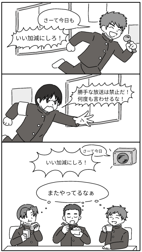 2026.04.01 漫画 風紀委員の人 okame-furukawa ※歴史創作フィクションサイトです。 実在の人物・団体・具体的な出来事とは関係ありません。 (放送を止めようとしてる風紀委員も走ってるんだよなー) と、食堂で放送を聞いてる3人は思ってます。 古川 おかめ歴史好きの北海道民。 みんなに笑って現代の北海道を謳歌してほしい。 そんな気持ちから“現代学園パロディ”という形を選んでいます。 フィクションの世界観設定として登場人物は全員、 漢字の名字+名前で統一しています。 歴史雑学自由研究まとめ → きたうみ日誌