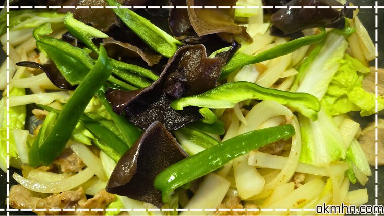 6. 玉ねぎ→白菜→ピーマン→キクラゲを30秒くらい時間差で入れて炒め合わせる